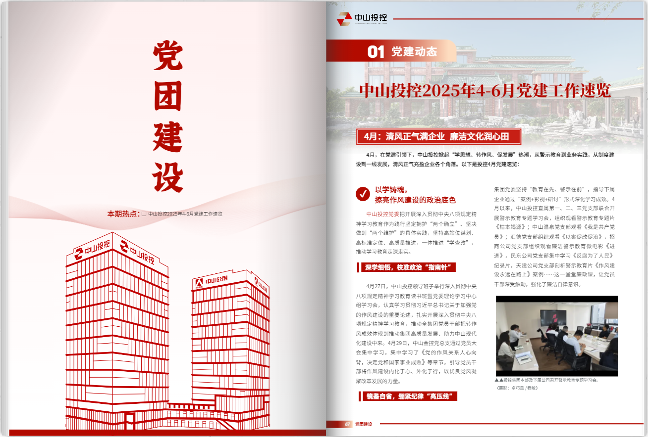 在“黨團建設”欄目中,中山投控黨委不忘初心使命,以“吃得苦,干得實、守得廉”的敬業本色,將黨建融入生產經營的血脈中。廉潔課堂上,他們的宣言擲地有聲;生態保護中,紅色的馬甲格外鮮明;義診服務里,他們的溫暖浸潤民心;“百千萬”的田埂上,他們的腳步丈量著土地的深情。紅色的力量,正化作攻堅克難的力量,推動我們走得更穩、更遠。