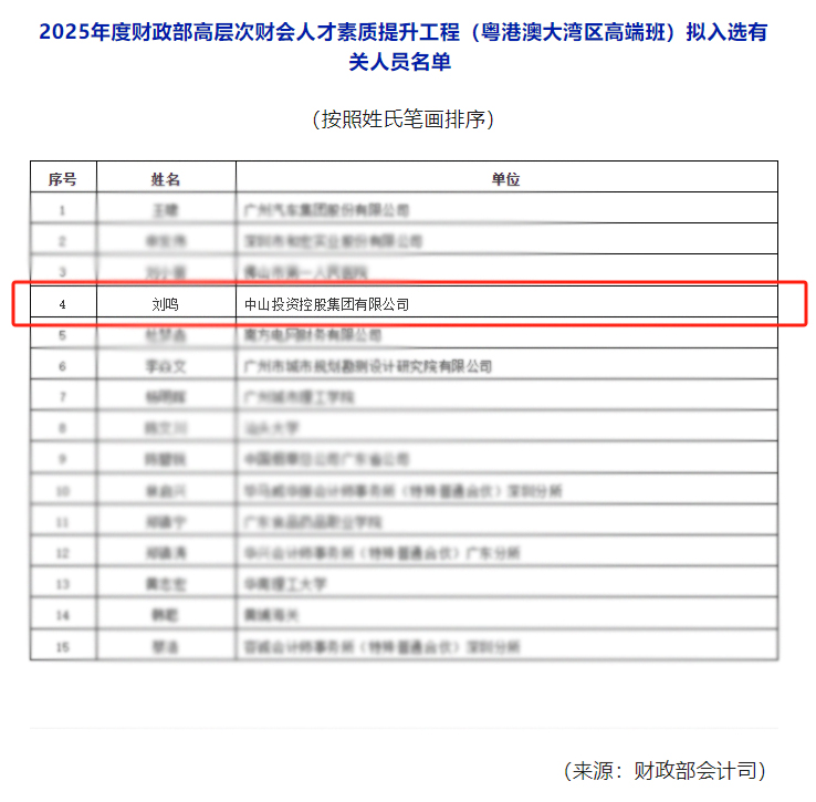 近日,中山投資控股集團有限公司副總經理劉鳴入選財政部2025年度高層次財會人才素質提升工程(粵港澳大灣區高端班)。