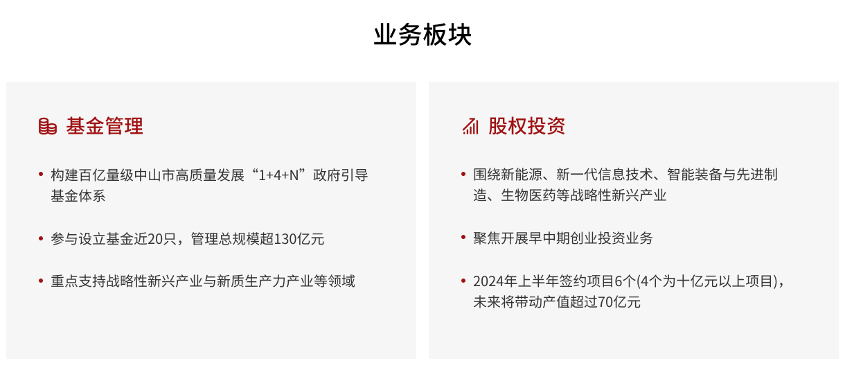 中山創業投資有限公司(簡稱“中山創投”)是中山投資控股集團有限公司(簡稱“中山投控”)落實中山市委、市政府“培育發展股權投資旗艦企業”要求,在中山金控資產管理有限公司及中山投控原有基金管理、股權投資業務基礎上整合組建,是中國證券投資基金業協會登記備案的私募基金管理人機構(中基協登記編號: P1065108)。中山創投組建完成后,承載著中山投控投資主業做強做優做大的使命,將圍繞新能源、新一代信息技術、智能裝備與先進制造、生物醫藥等中山市鼓勵發展的戰略性新興產業,推進大基金組建、大項目投資、大平臺建設,開展政府引導基金受托管理、股權直投等業務,為中山市經濟高質量發展貢獻國資創投力量。